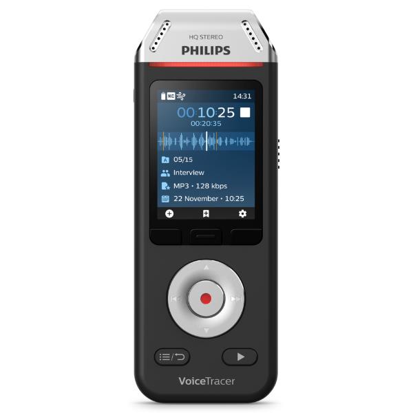 Philips Voice Tracer DVT2110/00. Tempo di registrazione massimo: 36 h, Modalità registrazione: Stereo (ST), Formati audio supportati: MP3, WAV. Tipo di display: LCD, Risoluzione del display: 240 x 320 Pixel, Dimensioni schermo: 5,08 cm (2). Potenza di uscita: 200 mW. Interfaccia: USB, Connettore USB: USB tipo-C. Tecnologia batteria: Polimeri di litio (LiPo), Durata batteria di registrazione: 36 h, Capacità della batteria: 1000 mAh