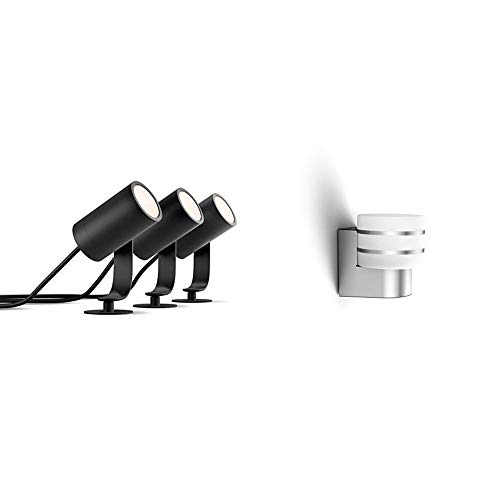 Philips Hue White and Color Lily Kit Base con 3 Faretti da Esterno Integrati, 8 W, Nero + Philips Hue white Lampada da parete LED Tuar Acciaio Spazzolato, Alluminio