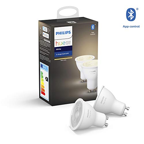 Philips Hue White, Faretti LED Intelligenti, Attacco GU10, 6W, 2 Pezzi [Classe di efficienza energetica A+] con Philips Hue Smart Button, Telecomando Controllo illuminazione Hue