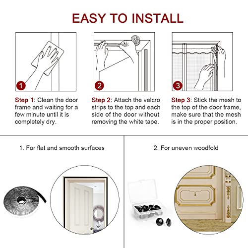 APPLICAZIONE IN POCHI MINUTI - Con la striscia di velcro in dotazione, la tenda può essere fissata al telaio della porta molto rapidamente e facilmente senza bisogno di attrezzi per praticare i fori. Abbiamo anche preparato chiodini per porte in legno.