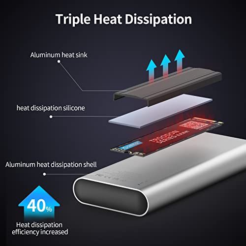 Dissipazione del calore tripla: la custodia M.2 SSD adotta un guscio in lega di alluminio ad alta durezza, un gilet di raffreddamento in lega di alluminio integrato e un cuscinetto termico in silicone. L'efficienza di raffreddamento è aumentata del 40%, proteggendo l'SSD da surriscaldamento e balbuzie durante il trasferimento di file di grandi dimensioni o la riproduzione e prolungando la durata.