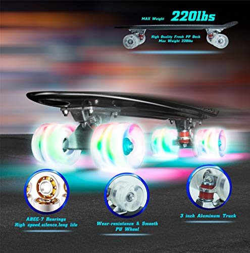 PHNHOLUN Skateboards Mini Cruiser Retro Skateboard, Skateboard in Plastica Completo Penny Board 22 pollici per principianti Adolescenti Adulti, Ruote Luminose a LED con Attrezzo a T All-in-One
