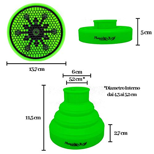 PHOENIX PRODUCTS Diffusore In Silicone Pieghevole 2a Generazione Portatile Da Viaggio Universale Phon Professionale Asciugacapelli Kit Oli Essenziali x Capelli Ricci Perfetti Naturali Fono (Verde)