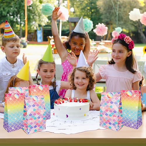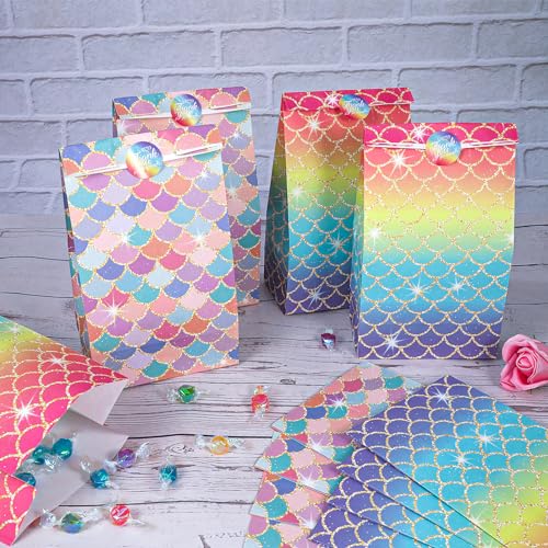 PHOGARY Sacchettini Compleanno Bambini, 24 Sacchetti Regalo di Carta con Modello di Scale a Sirena+24 Adesivi per Feste di Compleanno,Sacchetti Compleanno Bambini Borse per Feste e Borse per Bambini