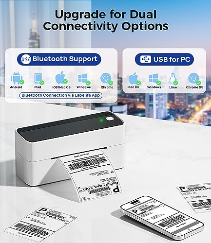 Stampa wireless tramite Bluetooth: collega la stampante per etichette al telefono o al PC tramite Bluetooth. Ridefinisce la semplicità delle stampanti per etichette di spedizione. (Connessione Bluetooth tramite l'app o software Labelife) È inoltre possibile collegare la stampante per etichette a Windows, Mac, Linux e ChromeOS tramite USB.