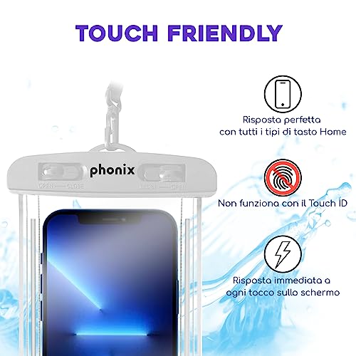 Phonix Custodia Impermeabile Smartphone IPX8 Italia - Cover Subacquea per iPhone 14,13,12,11 Pro, Max, Mini e per Smartphone fino a 6.8" - Portacellulare Mare - Accessori Spiaggia (Bianco)