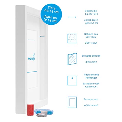 PHOTOLINI 3D cornice A4 21x30 cm bianco, profonda con vetro e passe-partout, cornice per oggetti fino a 1,5 cm di profondità, legno MDF - perfetta per il fai da te e come regalo