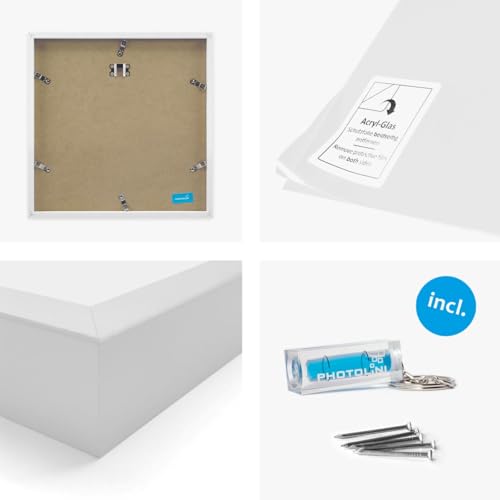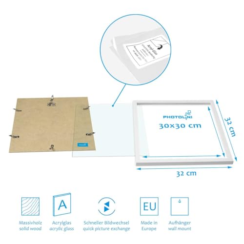 PHOTOLINI Cornici 30x30 cm legno bianco, Made in EU, set di 2 cornici in vero legno, plexiglass infrangibile, da parete, accessori extra - per le vostre foto e immagini preferite