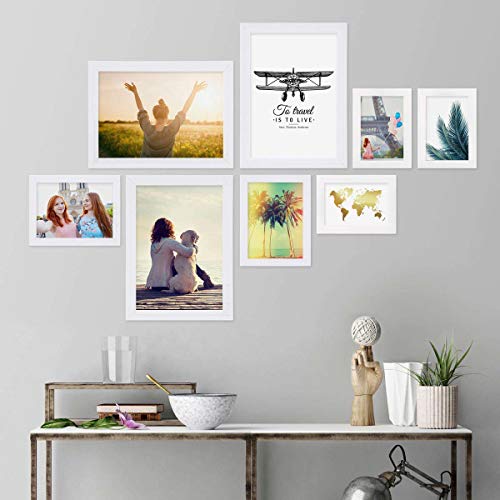 PHOTOLINI Set di 8 cornici bianco legno MDF, cornici larghe, moderne, plexiglass infrangibile, da tavolo o da parete, accessori extra - per una parete dal look raffinato