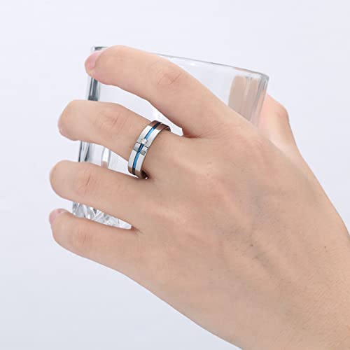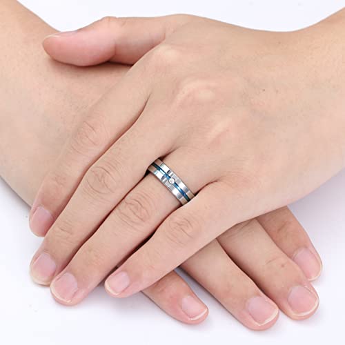 Anello classico in carburo argento una scanalatura blu e una lucente zirconia cubica. L'interno è lucidato e il bordo è piatto.