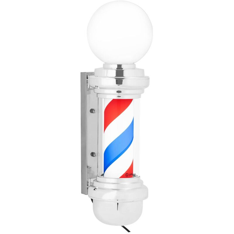 Attira i clienti nel tuo salone con il barber pole illuminato e girevole Il palo da barbiere è da secoli un simbolo per parrucchieri e barbieri. Quando è acceso, il cilindro girevole crea un magico effetto di linee rosse, blu e bianche che si avvolgono verso l'alto o verso il basso, indicando che il negozio è aperto. Grazie all'illuminazione a LED, puoi attirare l'attenzione dei clienti di passaggio anche quando è già buio. Die Friseurstange von physa besitzt einen 280 mm hohen Zylinder aus Acryl. Questo materiale non è solo estremamente leggero, ma anche infrangibile e resistente alle intemperie. Der Sockel aus Eisen mit Rostschutz garantiert eine stabile Montage mit einem Abstand von 25 cm zur Wand. Dabei bietet Ihnen das 1.5 m lange Stromkabel ausreichend Spielraum, um die Barber Pole genau da anzubringen, wo sie am meisten Aufmerksamkeit erregt. Mit zwei Schaltern aktivieren Sie den Permanentmagnet- Synchronmotor (PMSM) für die Rotationsbewegung sowie die Beleuchtung mit 25 LED