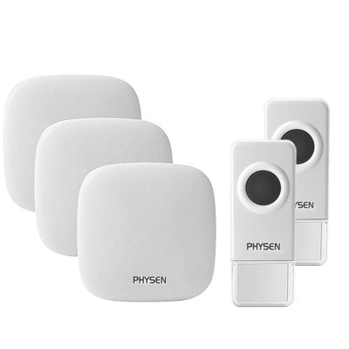 PHYSEN H1 campanello senza fili impermeabile, 2 pulsanti e 3 ricevitori plug-in, che funzionano ad una distanza di 1000 piedi, 4 livelli di volume regolabili con 52 melodie suonerie, Bianco