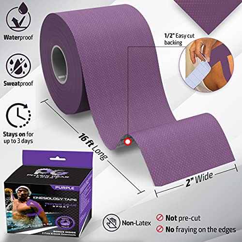 Physix Gear Tape kinesiologico - Nastro K Tape Sportivo 5m x 5cm Non Tagliato - Nastro Adesivo Impermeabile per dolori muscolari al Ginocchio, Gomito, Schiena, Spalla - Sport Tape con Guida 1PZ Viola
