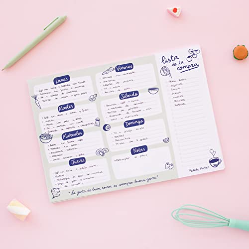 MENU, lista della spesa e note Questo pianificatore settimanale dei pasti è composto da più aree di aiuto per migliorare il tuo ordine settimanale: sette campi in primo piano per ogni giorno della settimana, lista della spesa e note. Ideale per tenere traccia dei tuoi prossimi pasti e lista dei supermercati.