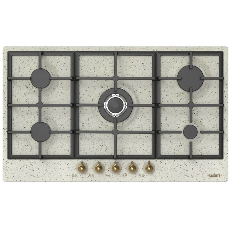 Samet piano cottura 5 fuochi da 90 cm. avena Aiace Caratteristiche: Colore avena Griglia in ghisa Piano cottura incasso 90 cm Manopole stile rustico Dispositivo sicurezza arresto fiamma ffd 5 bruciatori a gas Bruciatore Wok 3800 w Bruciatore rapido 3000 w Bruciatore semi-rapido 2 x 1750 w Bruciatore standard 1000 w Dimensioni: Dimensioni esterne 86x51 cm Dimensione foro 84x49 cm