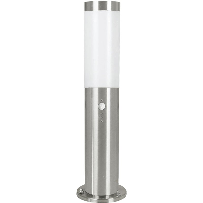 Collezione Helsinki LA LAMPADA CHE PORTA LUCE E STILE NEI TUOI AMBIENTI La piantana HELSINKI ha un corpo in acciaio inox a forma di cilindro alla cui estremità superiore è apportata una superficie luminosa a 360° in plastica bianca.. É dotata di un sensore di movimento e crepuscolare che accende la luce solamente al passaggio e quando veramente necessario. La lampada ha un sistema anti-spruzzo (IP44) che le consente di essere negli spazi esterni. Il design senza tempo completa abilmente l'ambiente esterno. La lampadina presente nell'immagine non è inclusa nella consegna. Per questa lampada per esterni è adatta qualsiasi lampadina (A60) con attacco E27.