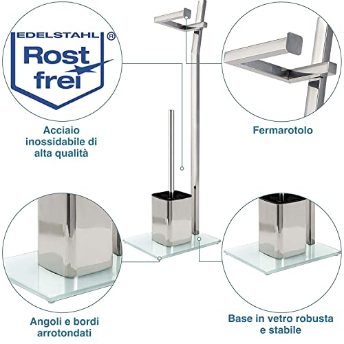 Set Wc Piantana - Cromo Lucido -22X18X70Cm- Portarotolo E Portascopino Incl. - Acciaio Inossidabile - Base In Vetro - Extra: 1+2 Testine Ricambio Spazzolone!