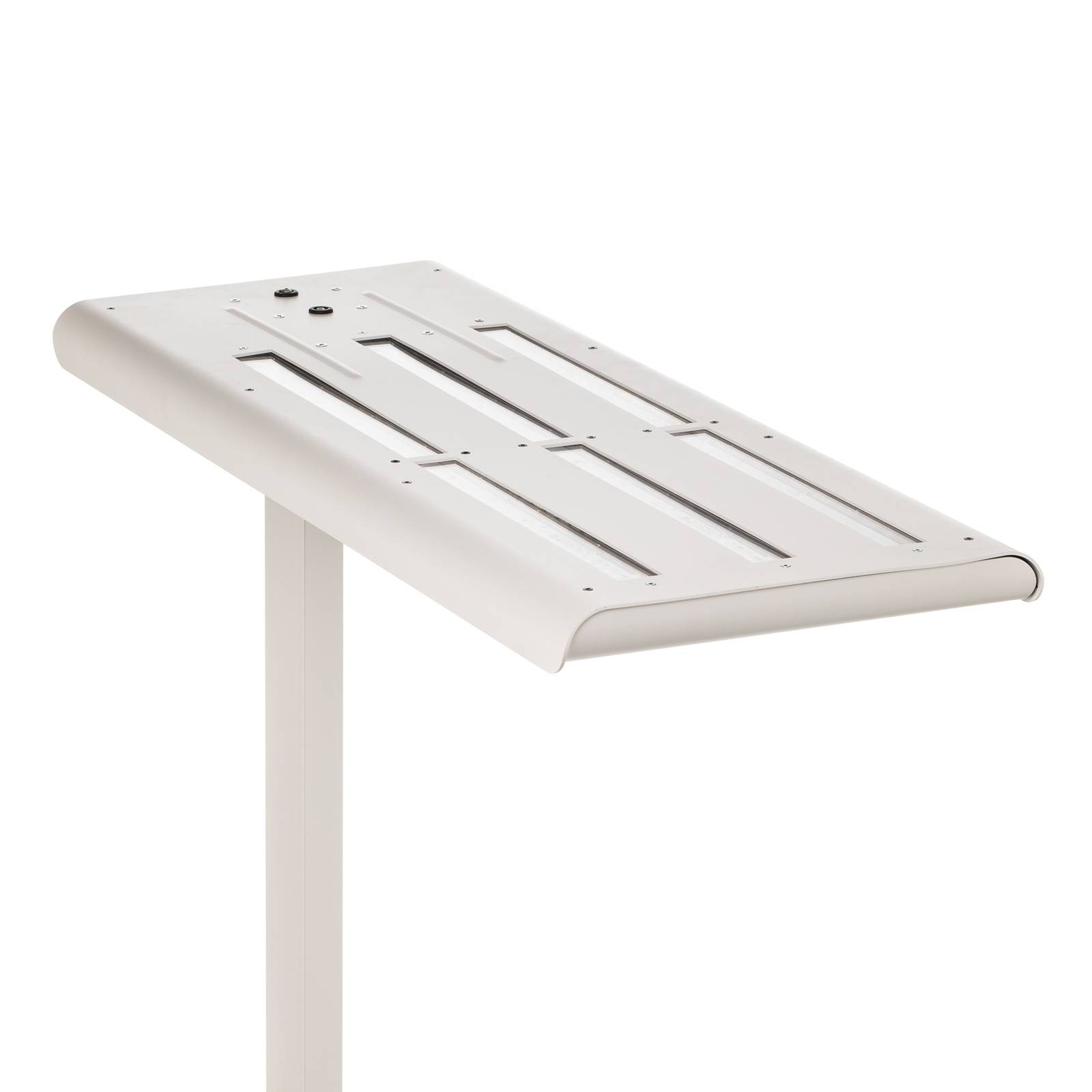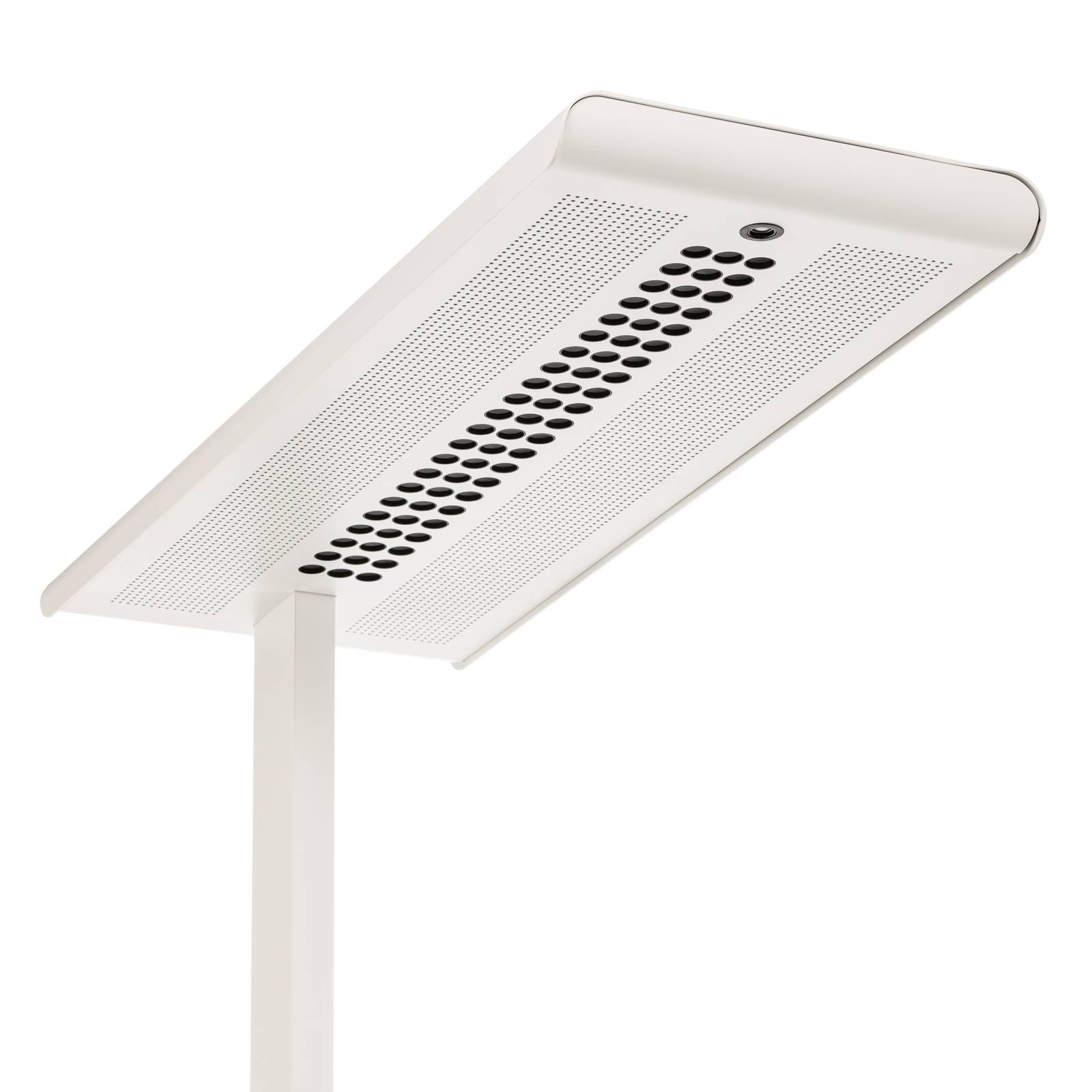 Comandato manualmente tramite interruttore dimmer o automaticamente tramite sistema di sensori - Optico LED a piantana con luce bianca universale diretta e indiretta In termini di controllabilità ed effetto luminoso, la piantana Optico LED è un punto di forza avanzato per l'illuminazione degli uffici moderni. Si compone di una base a forma di U in acciaio, un alto tubo di sostegno in alluminio e una testa dell'apparecchio rettangolare in alluminio con emissione di luce a micropunti. L'emissione di luce è ampia (60°), diretta e indiretta e anche antiabbagliante (UGR < 10), rendendo Optico ideale per le postazioni di lavoro VDU. Da un lato, l'apparecchio può essere azionato manualmente utilizzando i pulsanti sul tubo di supporto, che consentono la commutazione (pressione breve) e la dimmerazione (pressione lunga) separatamente per l'illuminazione di lavoro e ambiente. Inoltre, Optico ha un sensore di presenza e di luce diurna sulla testa, che viene utilizzato per il controllo automatico basato sulla presenza di persone e la luminosità dell'ambiente. I valori di luminosità preferiti possono essere salvati;