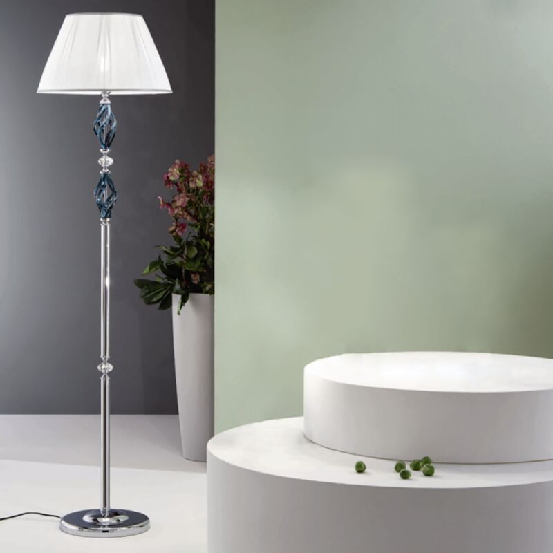 Piantana 1306 realizzato in vetro soffiato trasparente lavorato a mano con particolari e finitura in metallo. Cavetti in acciaio regolabili in altezza. Un elemento dalle linee classiche e raffinate, ideale per illuminare e al tempo stesso arredare con particolare eleganza i soggiorni in perfetto stile classico-contemporaneo.