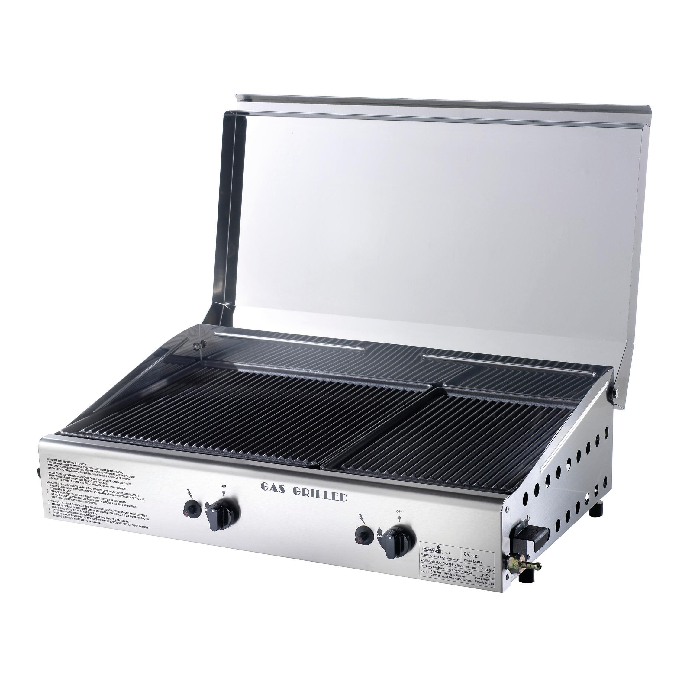 Doppia piastra di cottura cm 40x43 e 40x28 in ghisa vetrificata per alimenti A METANO. Camera combustione in acciaio inox. Coperchio in acciaio inox. Nr 2 bruciatori in lamiera alluminata ad accensione rapida ad una o due rampre di kW.6. Accensione piezoelettrica. Cappa paravento in acciaio inox. Cassetti raccogli sugo.