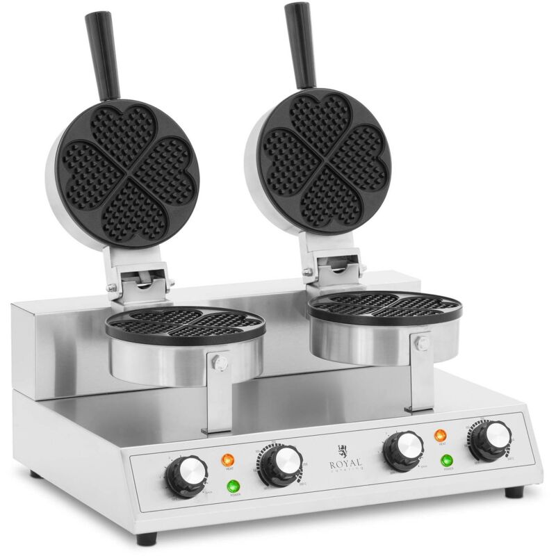 Gustosi waffle con la piastra doppia di Royal Catering Ottieni cialde fresche e croccanti in un attimo! Con la piastra doppia di Royal Catering puoi preparare dei buonissimi waffle nel tuo bar o nel tuo ristorante e sorprendere la tua clientela. Che sia nella versione dolce con cioccolato e frutti di bosco o salata con prosciutto e rucola, con questo semplice dispositivo puoi servire in un batter d'occhio deliziosi waffle da 180 mm ciascuno. L'alloggiamento della piastra per cialde professionale è realizzata in acciaio inox robusto e resistente ed è dotata di due piastre in alluminio sopra e sotto. Le piastre vengono riscaldate con una potenza di 2 x 1.000 W e permettono di preparare due waffle grandi e spessi 10 mm composto da 8 cuori alla volta. Le piastre permettono di rimuovere i waffle rapidamente. La protezione integrata sulle piastre fa sì che l'impasto in eccesso non sporchi la macchina dei waffle e facilita la pulizia. Tramite il termostato automatico puoi regolare la