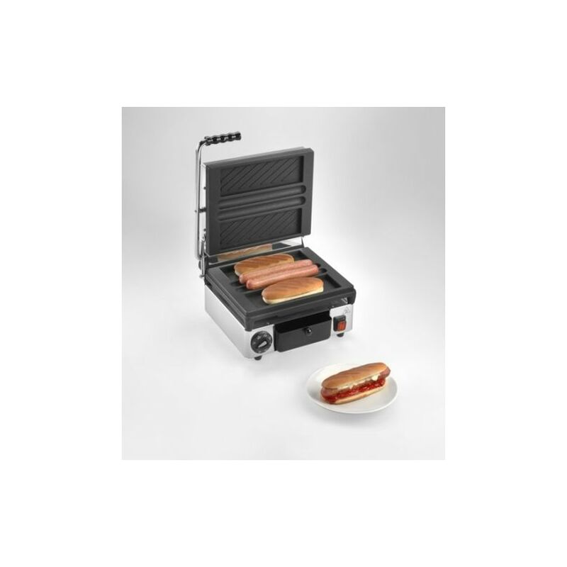 Codice RS9698 - Piastra wurstel hot dog modello MT-16009, dimensioni cm. 32x38x17 (lxpxh), 230 volt, 1730 watt, temperatura di esercizio 60-300 °C. Stuttura in acciaio inox, piastre in ghisa.