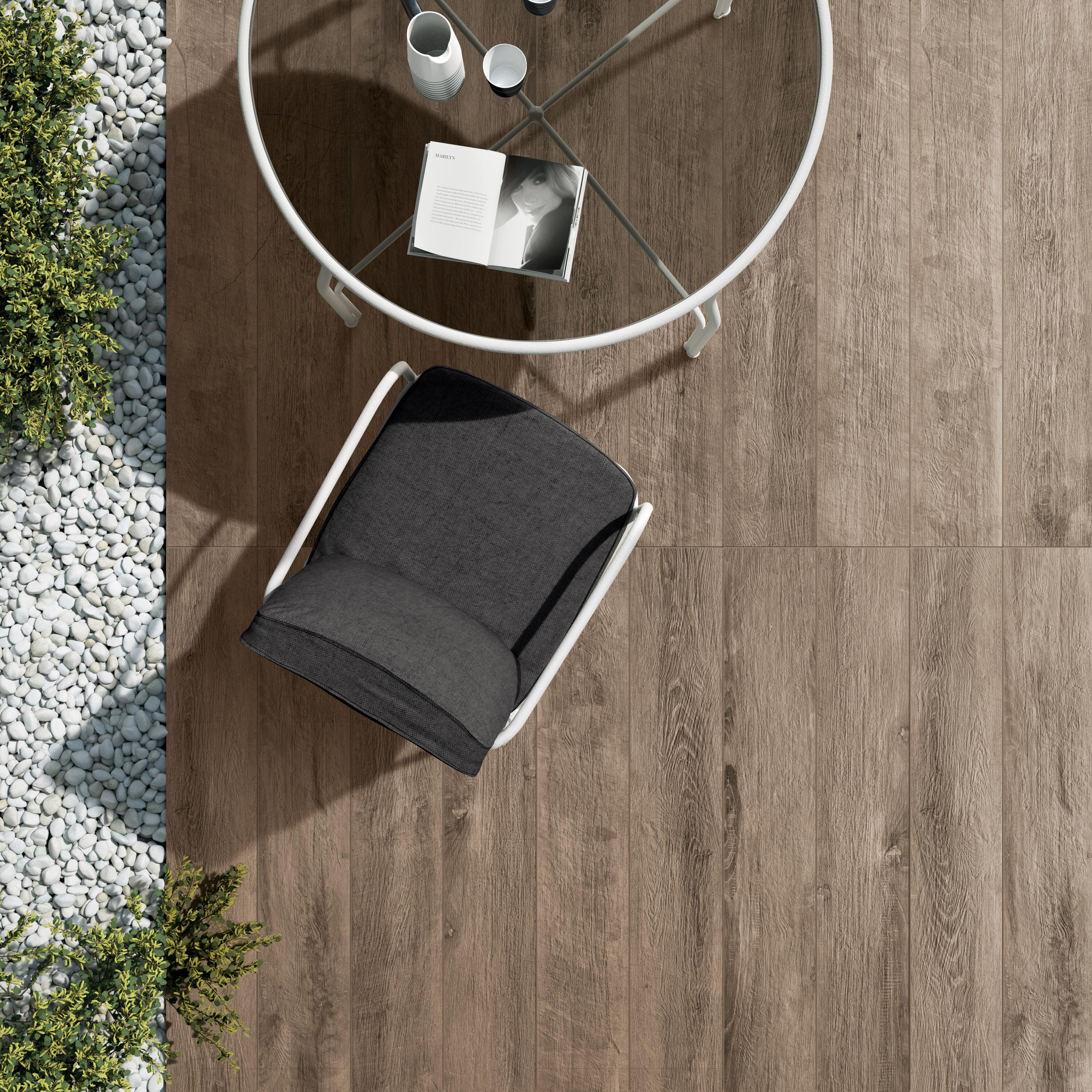 Effetto Legno. Confezione da 1,28 m². Ideale per un esterno carrabile. Resistente ad un calpestio forte.. Indicata per pavimento e rivestimento, in ambienti esterni ed interni. I bordi rettificati permettono di posare le piastrelle con una fuga minima di 1 mm creando una continuità estetica d'effetto