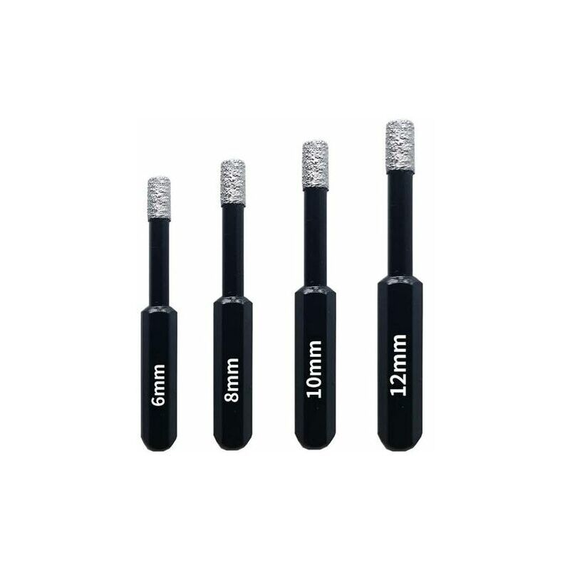 br/>Gambo: 6 mm Rivestimento diamantato fino a 10 mm Dimensioni: 6 mm, 8 mm, 10 mm, 12 mm Confezione: 4 punte diamantate brasate sottovuoto Suggerimenti caldi: Suggerimenti per l'uso del vuoto Punte diamantate brasate 1. Non utilizzare queste punte con la modalità martello. 2. Non installare queste punte solo su un trapano a filo, non su un trapano a batteria (potenza insufficiente). in piastrella, sconsigliato per materiale dietro la piastrella 4. Per la foratura orizzontale, basta esercitare una leggera pressione, per la foratura verticale, il peso della macchina darà una pressione sufficiente Iniziare a forare seguendo le seguenti istruzioni: 1) Posizionare il forare con un angolo di 45 gradi 2) Forare fino a 3) Portare il trapano in posizione verticale 4) Continuare a forare e far oscillare la