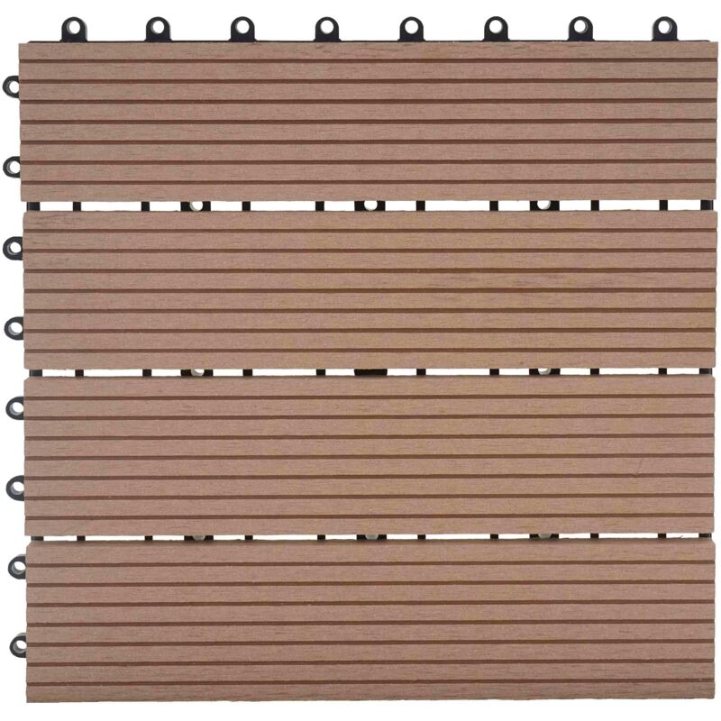 Piastrelle Premio per pavimento da esterno modello Rhone T831 11 pezzi 30x30 = 1mq WPC (Wood Plastic Composites) versione TEAK LINEARE WPC (Wood Plastic Composites), noto anche come legno plastica, è un materiale ideale per le piastrelle da esterno. Queste piastrelle sono perfette per il terrazzo, il giardino ma anche per il bordo della vostra sauna o della piscina! Inoltre l'elevata capacità di carico (fino a 2000kg/mq) consente di utilizzare le piastrelle come base per stand fieristici. Proponiamo questo prodotto in diverse versioni. Il WPC è un materiale innovativo composto dal 60% bambù e fibra di legno e dal 40% da plastica riciclata. Questa particolare composizione da vita ad un materiale di alta qualità rendendo la superficie resistente alle condizioni atmosferiche, all'usura e allo scolorimento. adatte per ambienti esterni ed interni realizzate in WPC (Wood Plastic Composites) modello Premium: elevata capacità di carico fino a 2000kg/mq con 8x anelli di connessione per lato da