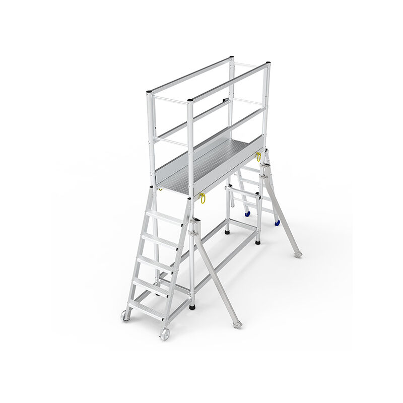 USO - Piattaforma per cantieri di costruzione e lavori edili. - Materiale ideale per interventi a spazio limitato. - Passerella per lavoro e intervento tra due banchine di lavoro secondo procedura professionale edile con il massimo di sicurezza. - Piattaforma ideale per i lavori edili e operazioni tra banchine. SPOSTAMENTO FACILE - Piattaforma in alluminio dotata di scala fissa alle ruote non portanti Ø 125 mm e una scala d'accesso retrattile. - Maniglie di trasporto retrattili e piattaforma con ruote facile da spostare di qualche metro per garantire il lavoro. CARATTERISTICHE - 2 sportelli automatici da ambo i lati della piattaforma per facilitare l'accesso e ottimizaare la sicurezza. - 4 anelli guabili per spostare facilmente la piattaforma sui cantieri. - Gradini larghi dalla profondità di 80 mm. - Pedane in alluminio a bandiera a scacchi per evitare lo scivolamento dell'operatore, dimensioni 0.49 x 1.50m. ALTEZZA DI LAVORO COMODA - L'altezza di lavoro comoda corrisponde