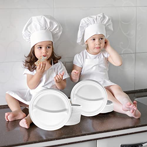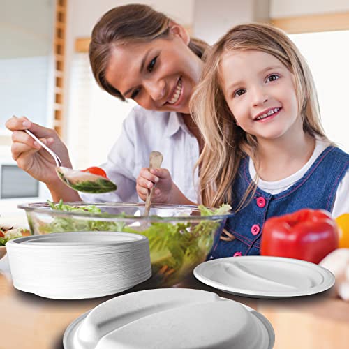 100 Piatti usa e getta da 23 cm con 2 scomparti. Piatti di canna da zucchero, stoviglie usa e getta extra forti di colore bianco. Piatti rotondi. per campeggio, picnic, feste, barbecue, compleanni