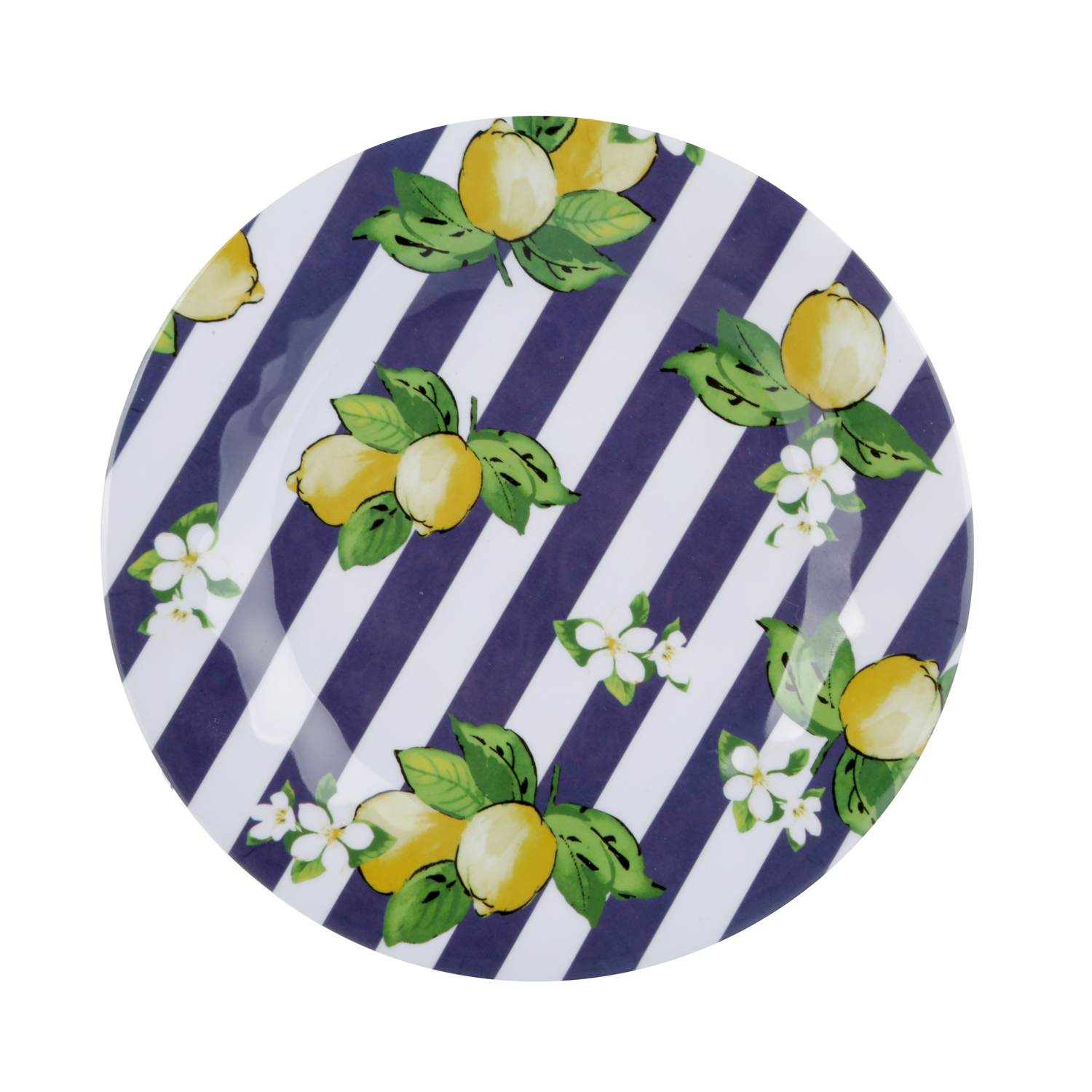 Il decoro di limoni su vivace sfondo a righe blu parla di mare, estate, buon cibo e momenti conviviali. Scegli dunque questo piatto frutta per i tuoi pranzi estivi all'aperto: la composizione in melammina è resistente a urti, graffi e cadute e a prova di bambini super scatenati! Il decoro che la caratterizza è già un'opera d'arte a sè, ma abbinato a golose specialità culinarie valorizzerà ancora di più i tuoi momenti a tavola. Crea il tuo set coordinato con piatto fondo e piano della linea. Lavabile in lavastoviglie.