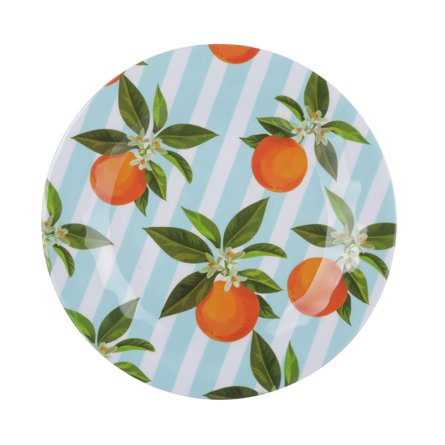 Il decoro di arance su vivace sfondo a righe azzurre parla d'estate, buon cibo e momenti conviviali. Scegli dunque questo piatto piano sfuso per i tuoi pranzi estivi all'aperto: la composizione in melammina è resistente a urti, graffi e cadute e a prova di bambini super scatenati! Il decoro che la caratterizza è già un'opera d'arte a sè, ma abbinato a golose specialità culinarie valorizzerà ancora di più i tuoi momenti a tavola. Crea il tuo set coordinato con piatto fondo e frutta della linea. Lavabile in lavastoviglie.