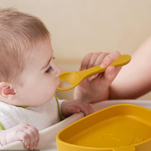 【Design scientifico】 Cucchiaio e forchetta in silicone di questi set di pasti progettati per le gengive sensibili dei bambini. Manico di cucchiaio e forchetta, solido rispetto ad altri manico in silicone, adatto per la pappa. Piatti per bambini hanno diviso design, evitano l'odore di cibo per bambini.