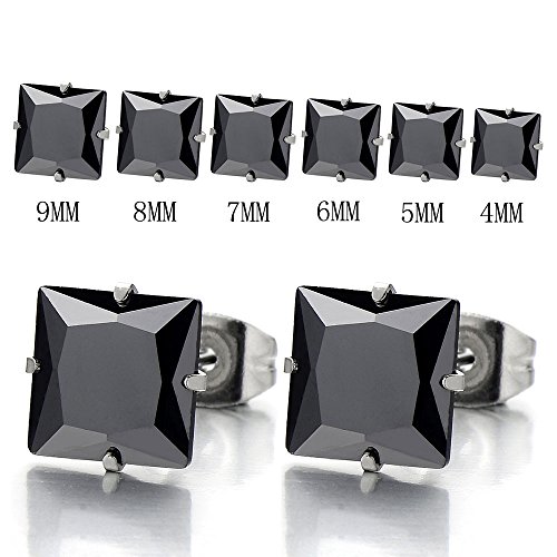 8MM Nero Piazza Zirconi, Orecchini da Uomo Donna, Orecchini a Lobo, Acciaio Inossidabile, 2 Pezzi