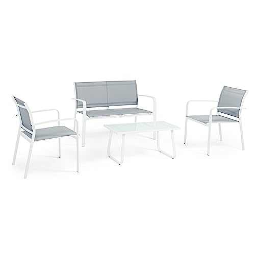 Totò Piccinni Salottino da Giardino ARENT da esterno con divano e poltrone in metallo e textilene tavolino con piano in vetro (Bianco)