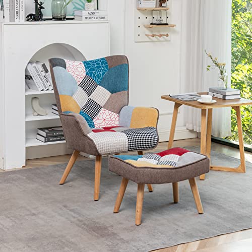 Poltrona con sgabello poggiapiedi imbottiti e rivestiti con tessuto patchwork comodo e resistente.