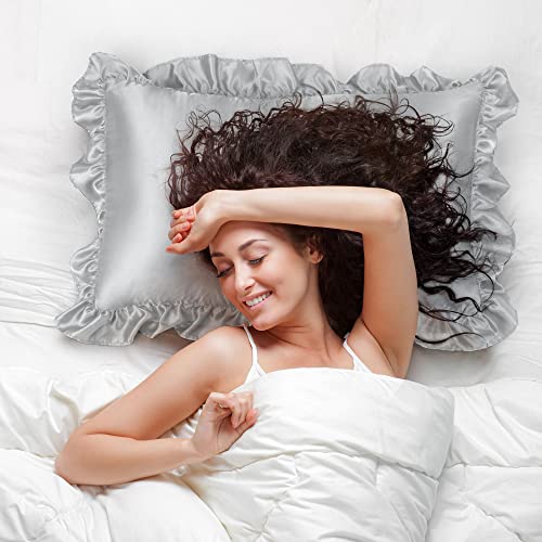 PiccoCasa Federe in raso per capelli e pelle, federe in raso con volant e chiusura a busta, confezione da 2 federe color argento, 50 x 65 cm