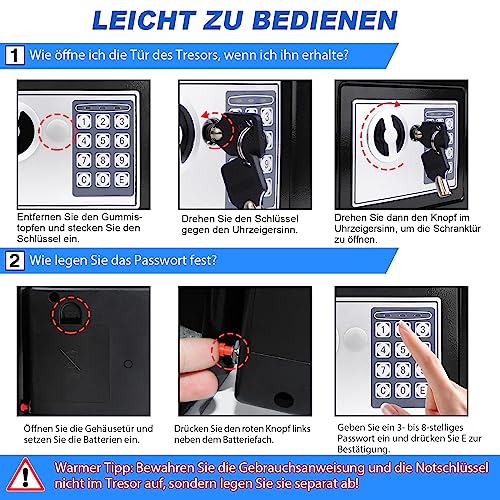 Modo sicuro per sbloccare: la cassaforte è dotata di un codice PIN digitale, che può programmare un codice da 3 a 8 cifre come password, e una serratura nascosta con una chiave, a cui si può accedere anche con 2 chiavi di emergenza. Dimenticando il codice e la batteria è vuota o altri incidenti. Include cerniera a prova di manomissione, timeout dopo 3 falsi tentativi di combinazione per sbloccare.