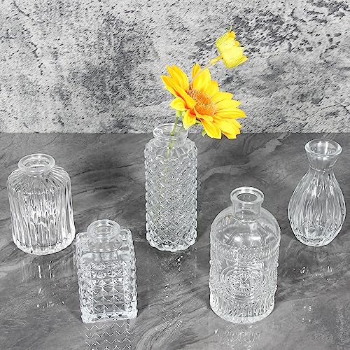 VETRO ISPESSITO: Questi piccoli vasi da fiori sono realizzati in vetro spesso e resistente, la parete spessa della bottiglia e il design del fondo ispessito rendono i vasi di gemme di vetro più durevoli e non si rompono facilmente. Il trattamento della superficie e il colore trasparente del vetro li fanno sembrare molto strutturati e li fanno brillare sotto la luce. È possibile vedere la bellezza dei singoli steli di fiori e delle talee da giardino in modo vivido dal vaso di vetro.