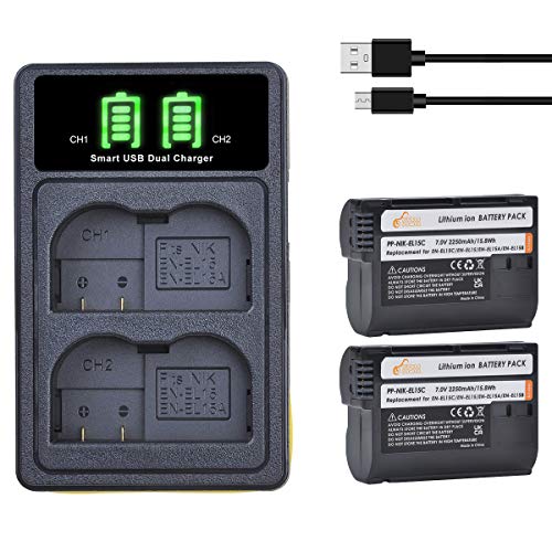 Pickle Power 2x Batteria EN-EL15 EN-EL15B EN-EL15C(2250mAh) e Caricabatterie Dual USB intelligente per Nikon Z5 Z6 Z7 Z6II Z7II D780 D850 D7500 D500 D600 D610 D750 D800 D810 D7100 D720000