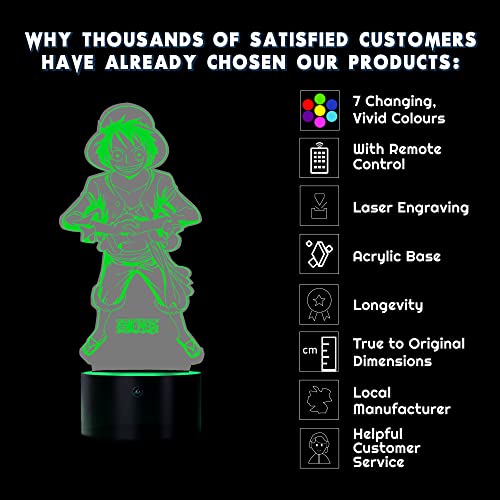 MATERIALE DI ALTA QUALITÀ: la tavola in acrilico è resistente e arrotondata sui bordi, quindi è innocua per bambini e animali. L'incisione laser Ruffy è finemente lavorata e dona alla stanza un aspetto moderno. Questa lampada a LED anime emette una luce uniforme e illuminerà splendidamente il tuo ambiente. La lampada viene azionata tramite un cavo micro USB con telecomando per cambiare il colore della luce.