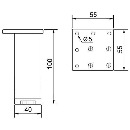 Altezza: 100 mm / tubo: 40 x 40 mm (rinforzato internamente sugli angoli) / piastra di montaggio: 55 x 55 x 2 mm / foratura di fissaggio: 5 x Ø 5 mm