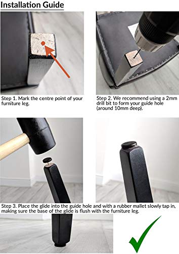 Durante il montaggio, si consiglia di utilizzare una punta da 2 mm per formare un foro di guida intorno a 10 mm di profondità nella gamba del mobile e quindi martellare delicatamente l'aliante con un martello di gomma. (Punta da trapano da 2 mm inclusa con il vostro ordine per aiutare con l'installazione)