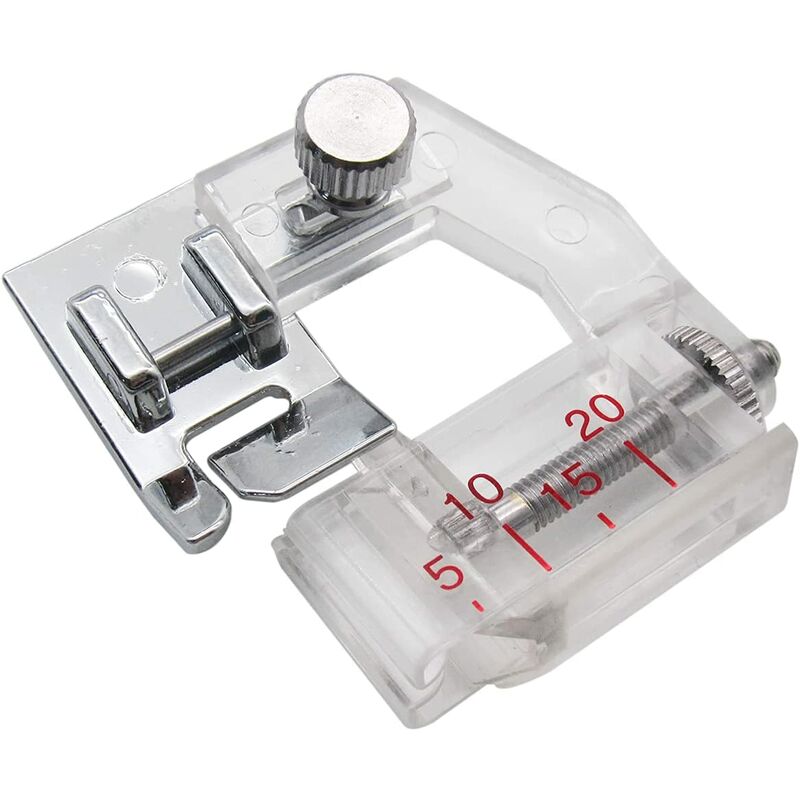 Il piedino per nastro sbieco della macchina da cucire è realizzato in metallo resistente e plastica dura. Il design chiaro rende facile vedere il tessuto cucito durante la realizzazione di progetti. Il piedino per sbieco della macchina da cucire può cucire perfettamente il bordo avvolgente del nastro in tessuto, garantendo l'effetto di cucitura uniforme su entrambi i lati. Semplifica la cucitura per gli utenti. La larghezza di un lato della striscia di tessuto è regolabile da 5 mm a 20 mm tramite la vite di regolazione del piedino regolabile. Facile da installare: Il piedino per rilegatura per macchina da cucire è dotato di un sistema a scatto del piedino corto che si aggancia al supporto della macchina in modo da poter utilizzare e sostituire qualsiasi piedino a scatto senza un cacciavite. > Piedino premistoffa di alta qualità per macchine da cucire a gambo basso, tra cui Singer, Brother, Babylock, Euro-Pro, Janome, Kenmore, White, Juki, New Home, Simplicity, Necchi e Elna e altri.