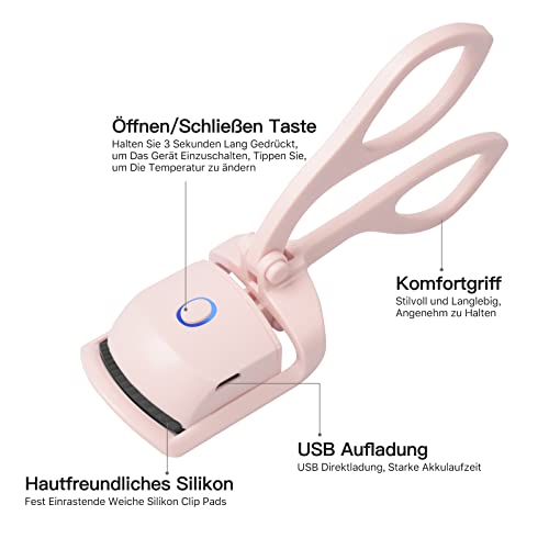 Piegaciglia Riscaldato, Piegaciglia Elettrico, Bigodino riscaldato per ciglia, 2 marce, Arricciati in pochi secondi, Naturali a Lunga Durata, Portatile e Facile da Usare (Rosa)