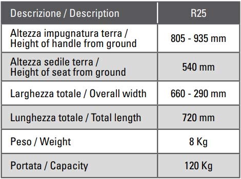 Altezza sedile da terra: 54 cm - Altezza impugnatura da terra: 80,5 cm / 93,5 cm