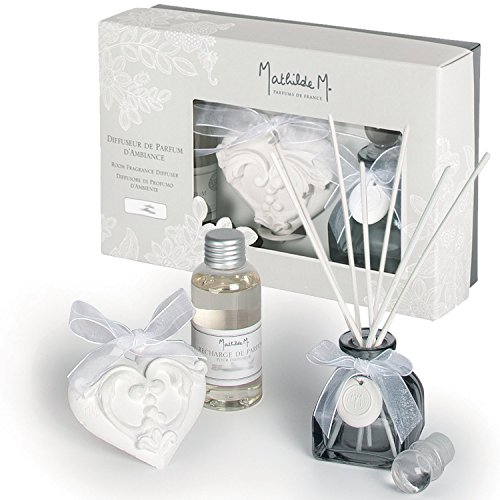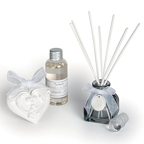 La scatola contiene il diffusore, cuore in gesso profumata, 7 bastoncini in rattan e ricarica 100 ml di profumo