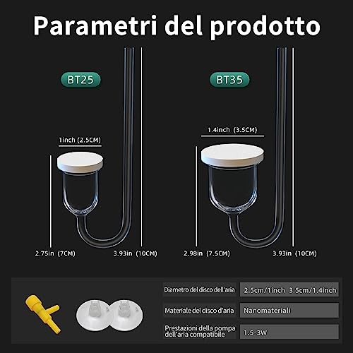 Potenza della pompa ad aria: la pietra porosa deve essere utilizzata con pompa ad aria, potenza consigliata della pompa ad aria > 1,5 W. La pietra d'aria è compatibile con il tubo dell'aria con diametro interno di 4 mm (nota: la pompa ad aria non è inclusa)