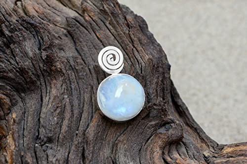 Materiale: argento 925, pietra di luna arcobaleno * Lunghezza totale: 2,5 cm * Dimensione pietra: 14 mm * Dimensione spirale: 10 mm * Taglio pietra: cabochon * Diametro interno dell'occhiello del ciondolo: 2,5 mm